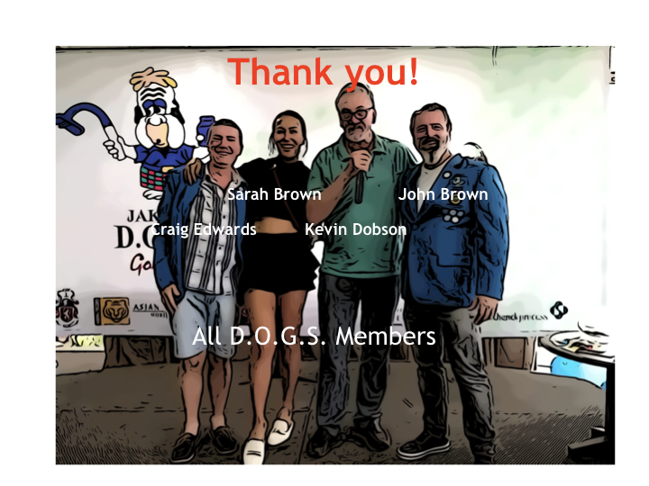 During the ceremonies James Bristow and Douglas McQuater took over the stage to present a very surprised committee some gifts on behalf of all the D.O.G.S.; a lovely bottle of perfume for Sarah Brown, a delicious bottle of whisky each for Kevin Dobson and John Brown and a massive amount of beer, which was used as a step stool, for Craig Edwards. We are humbled and very grateful for this thoughtful gesture! Due to unfortunate circumstances Kevin was unable to be with us and John accepted on his behalf.