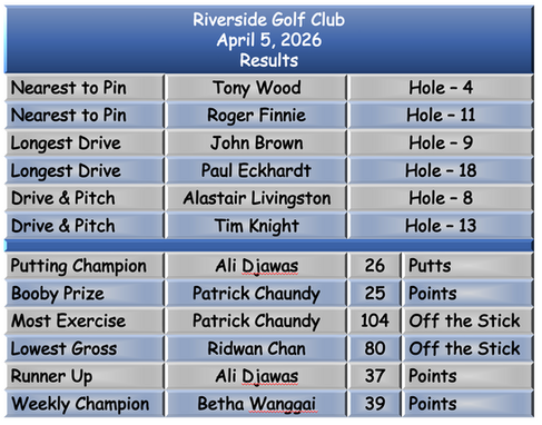 Tony Wood and Roger Finnie shared the Nearest to Pin prizes. Paul Eckhardt secured one of the Longest Drives, while President John Brown took the other. Tim Knight and Alastair Livingston each claimed a Drive & Pitch. Patrick Chaundy endured a challenging day, taking home both the Booby Prize and Most Exercise.