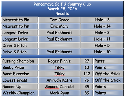 Roger Finnie emerged as the Putting Champion, while Tikky made her husband Paul Barnett proud by winning the Booby Prize and Most Exercise. Anirudh Katre secured the Lowest Gross title. Sepand Zarrabi settled for Runner Up, narrowly losing out on count back to Weekly Champion Mark Ryan, who was visiting from California.
