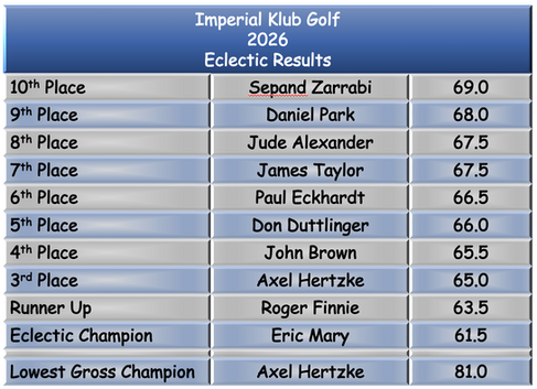 With Match Play concluded and weekly prizes awarded, there was still some important business to address. The top 10 saw significant shifts, with several players making impressive strides up the leaderboard. Axel Hertzke maintained his consistent performance to secure the Lowest Gross Champion title and claimed 3rd Place in the Eclectic. Roger Finnie achieved four improvements, propelling him into Second Place. Our new 2026 Rancamaya Eclectic Champion made two crucial improvements in the final round, proving to be decisive. Congratulations to Eric Mary!