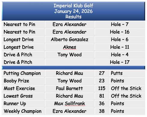 Going into our penultimate Richard has worked himself to the number 1 spot in the Eclectic with Ezra close behind. Don Duttlinger couldn't make any improvement and has slipped to 3rd but is still in the lead for "The Imperial Klub Golf – Rod Williams Memorial Challenge".